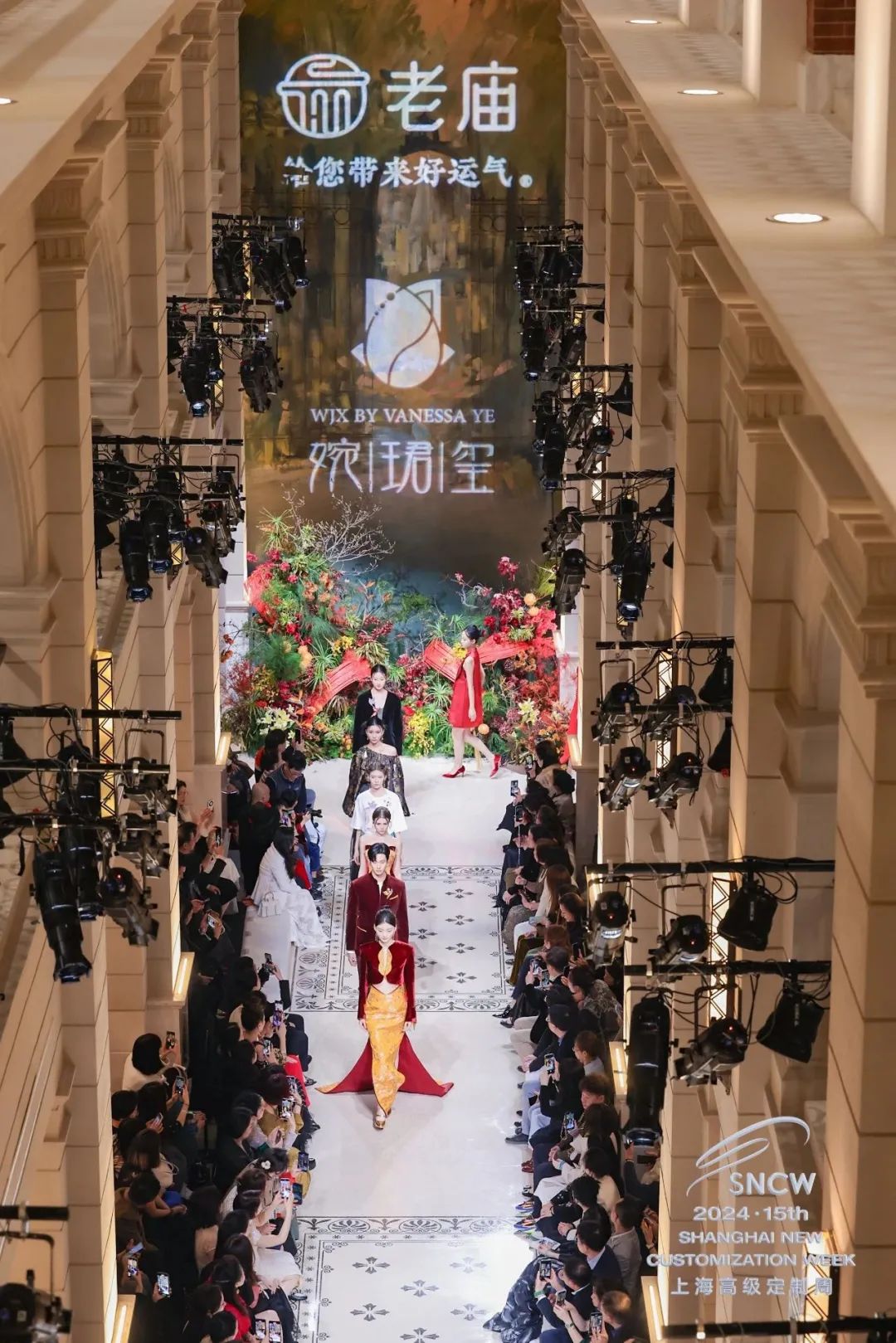 当晚的开幕大秀是由老庙与WJX婉珺玺共同呈现的“鹊说新语”,一同述说十里红妆的新中式浪漫