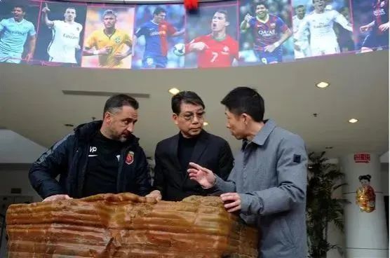 2018年初,作为上港队主教练的佩雷拉(左一),在俱乐部人士陪同下前往崇明拜访球队创始人徐根宝。