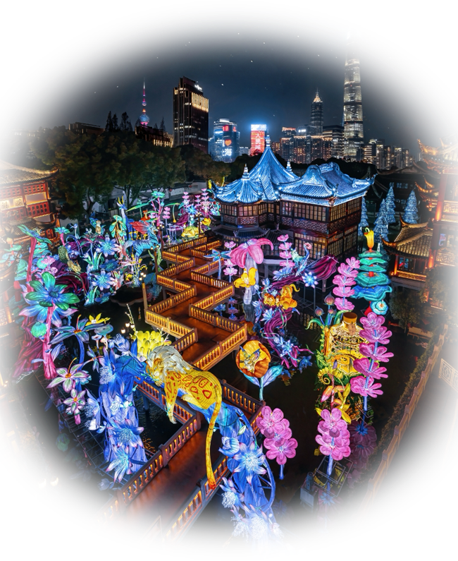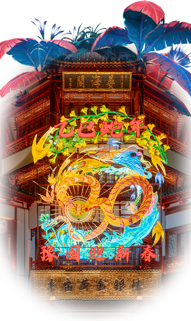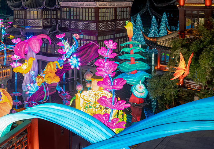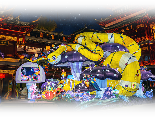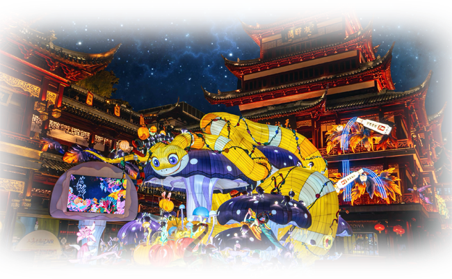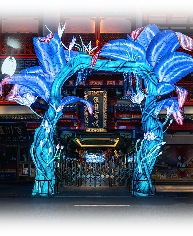“去年元夜时,花市灯如昼”。穿越豫园灯会三十年灯彩历程,一次欣赏遍中国十大灯彩流派的经典造型。豫园老街上造型缤纷的灯笼,寓意美好气息,感受中国灯彩艺术的和合之美。