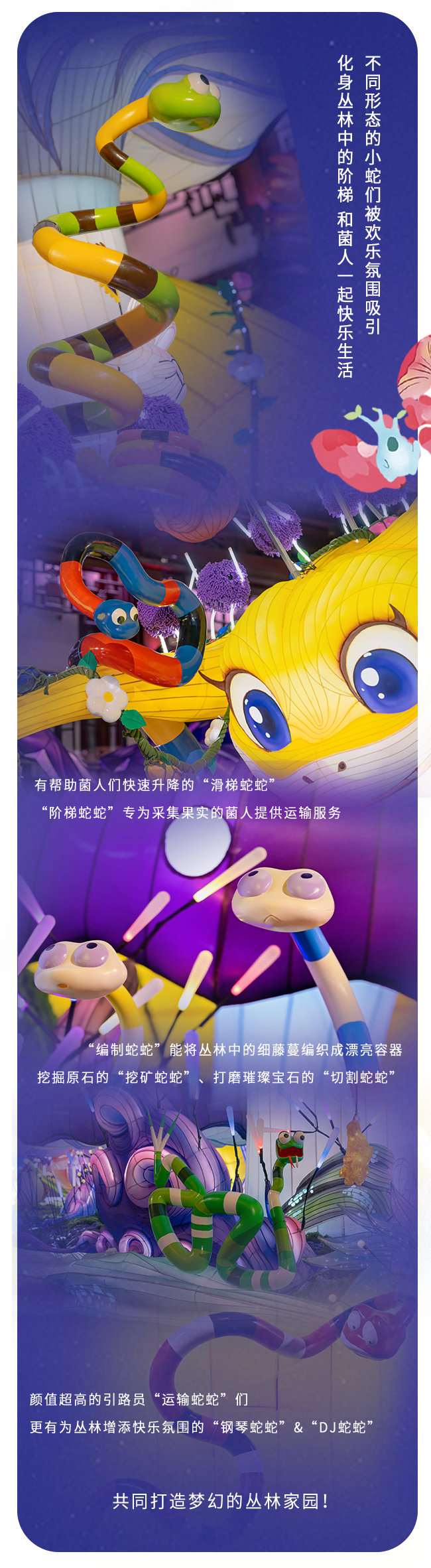 今年,中心广场上演不同以往的松弛感故事。从万物有灵大主题展开,围绕森林主题,打造小菌人、小蛇、灵蛇共生的原始蘑菇丛林。金色灵蛇盘绕在蘑菇丛林中,与可爱菌人一同奏响一场丛林交响曲,传递新年节日的祝福,以趣味的创意表达带来活力气息。
