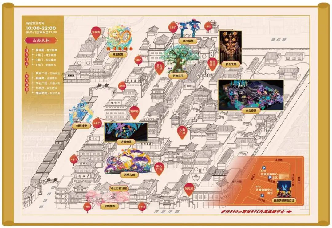 还有国潮乐队演绎山海潮音、古风舞台展现山海灵韵,以及灯组同款山海神兽化身真人NPC,和游人进行趣味互动,有机会解锁新年好运礼物!