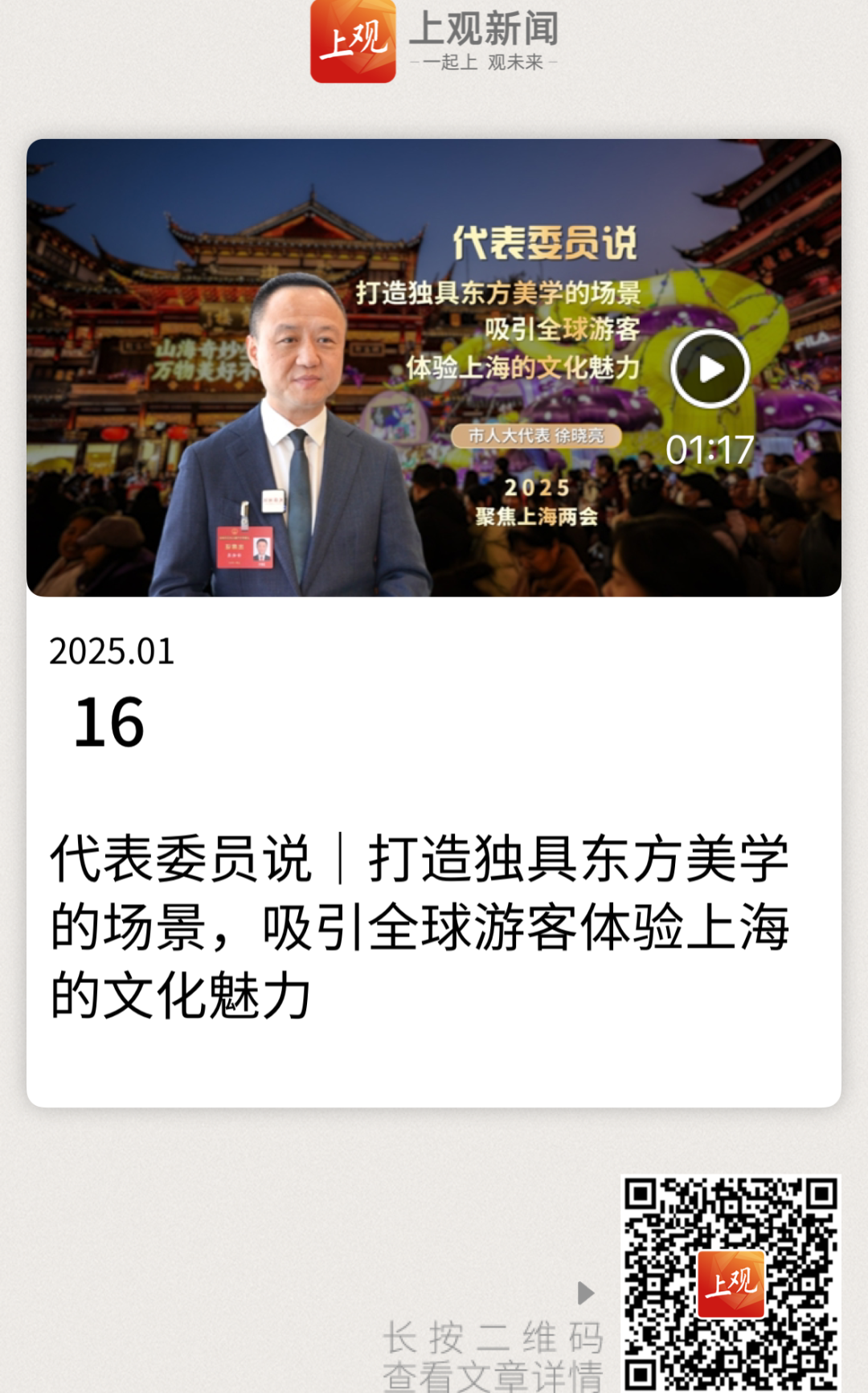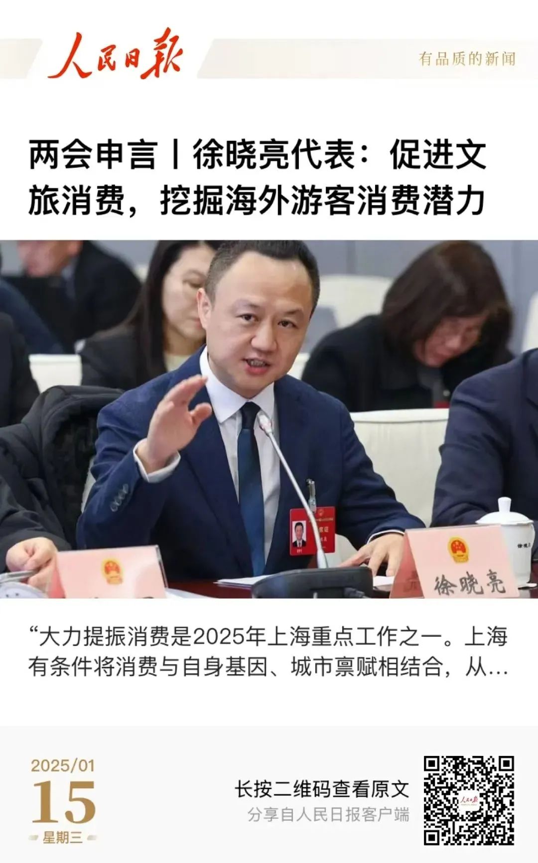 本次大会,徐晓亮提交了两份建议,分别为《关于发展文旅新质生产力,助力上海打造世界级文旅目的地的建议》和《关于以“东方生活美学”促城市文化软实力提升的建议》。