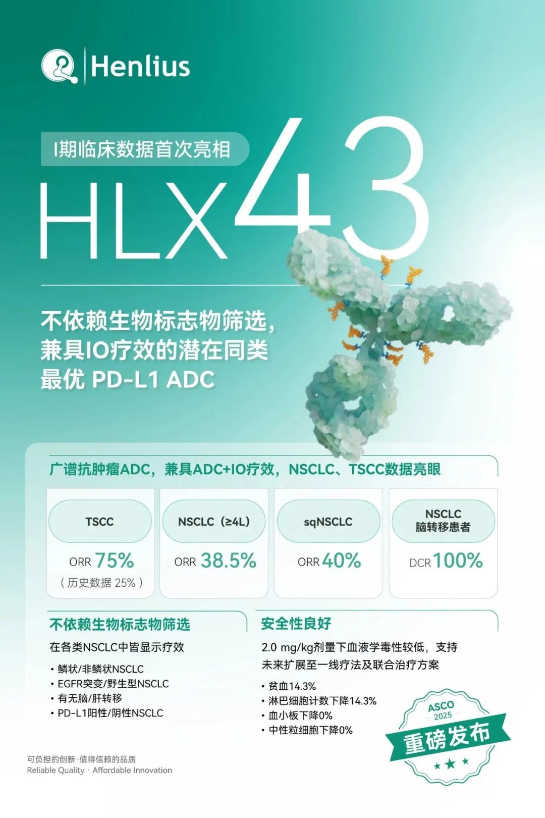 2025年6月3日,在2025美国临床肿瘤学会(ASCO)年会上复宏汉霖首次公布了HLX43(PD-L1 ADC)治疗晚期/转移性实体瘤患者的I期临床试验数据,该研究由中国医学科学院肿瘤医院王洁教授担任牵头主要研究者。凭借精准的分子设计和多重创新机制,HLX43在晚期/转移性实体瘤患者中显示出优异的抗肿瘤活性和可控的安全性,尤其在非小细胞肺癌(NSCLC)和胸腺鳞状细胞癌(TSCC)患者人群中展现了令人鼓舞的初步疗效,具备同类最优产品的开发潜力。目前,全球范围内尚无PD-L1 ADC获批上市,HLX43有望解决PD-1/L1免疫疗法不响应或耐药问题,为更多晚期/转移性实体瘤患者带来新的治疗选择。
