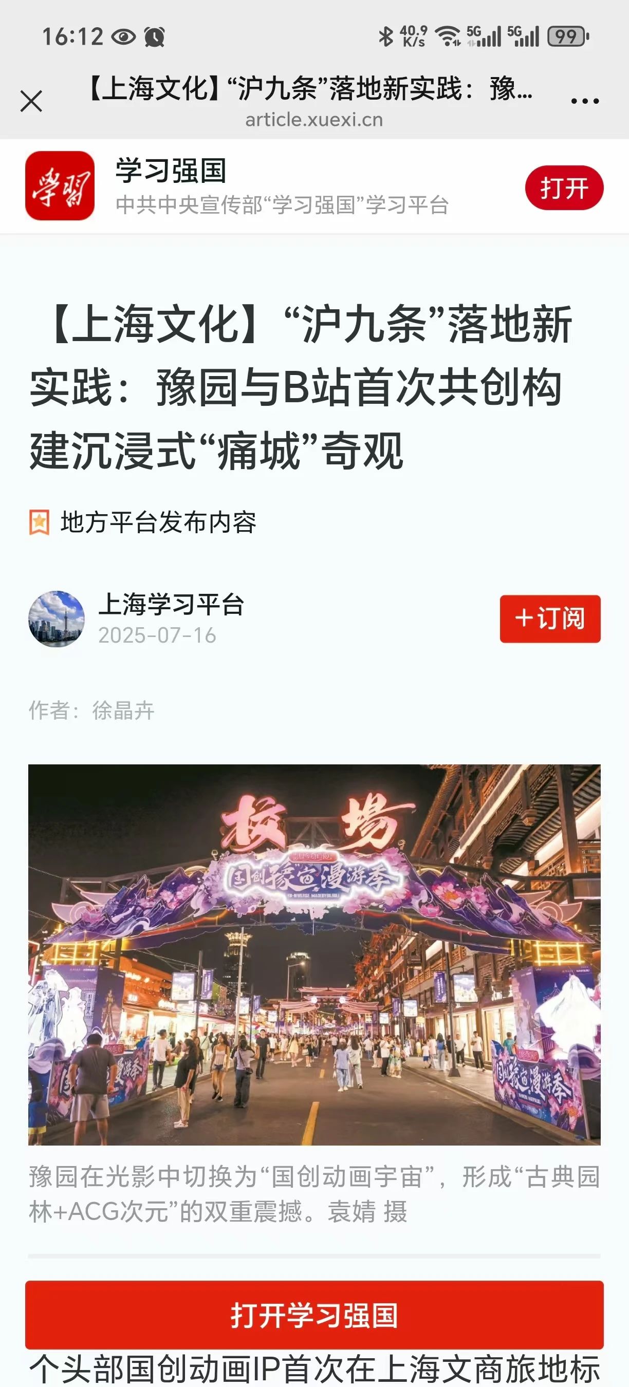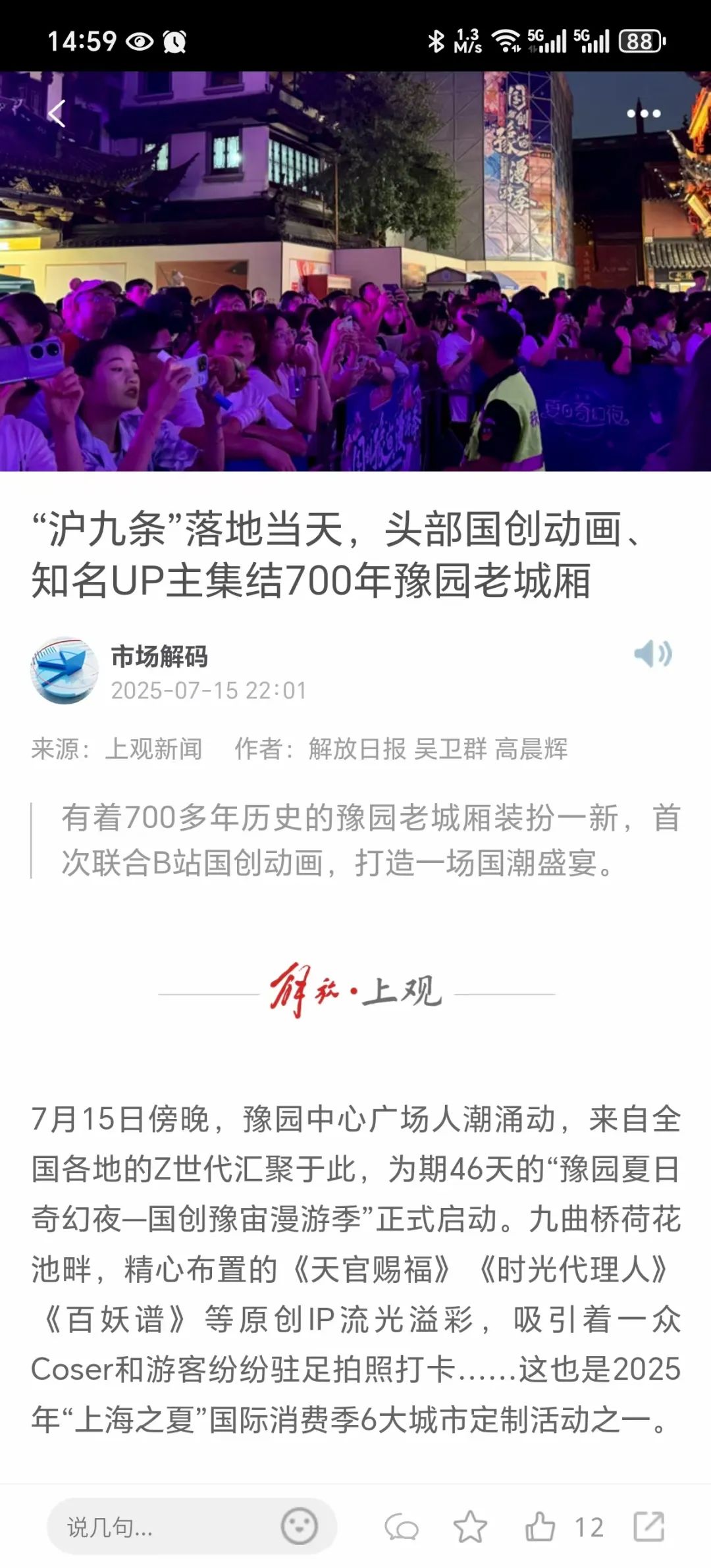 7月15日,作为2025“上海之夏”国际消费季6大城市定制活动之一——“豫园夏日奇幻夜·国创豫宙漫游季”正式启动。当天恰逢上海推出支持互联网优质内容创作“沪九条”,提出推动上海地标景区等场景资源向创作者开放,提供创作便利。有着700多年历史的上海文商旅地标——豫园商城装扮一新,首次携手哔哩哔哩(以下简称“B站”)国创动画,打造一场国潮盛宴。