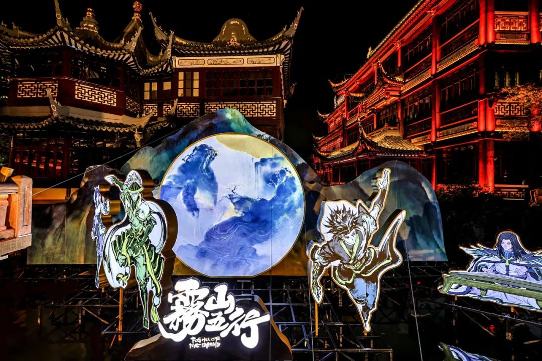 踏入豫园商城2号门,宛如启动次元穿梭的开关。被誉为“中式浪漫天花板”的凝晖路,被精心还原为动画《天官赐福》中的极乐坊。豫园老街与《时光代理人》以“时光穿梭”为纽带,将动画叙事与现实空间紧密缝合。九曲桥畔,《百妖谱》的百夭桃树、《牧神记》的大墟秘境、《雾山五行》的泼墨山水与《天官赐福》的明灯三千在激光雾森中流转成灵动画卷,缔造出令人屏息的东方幻想世界。