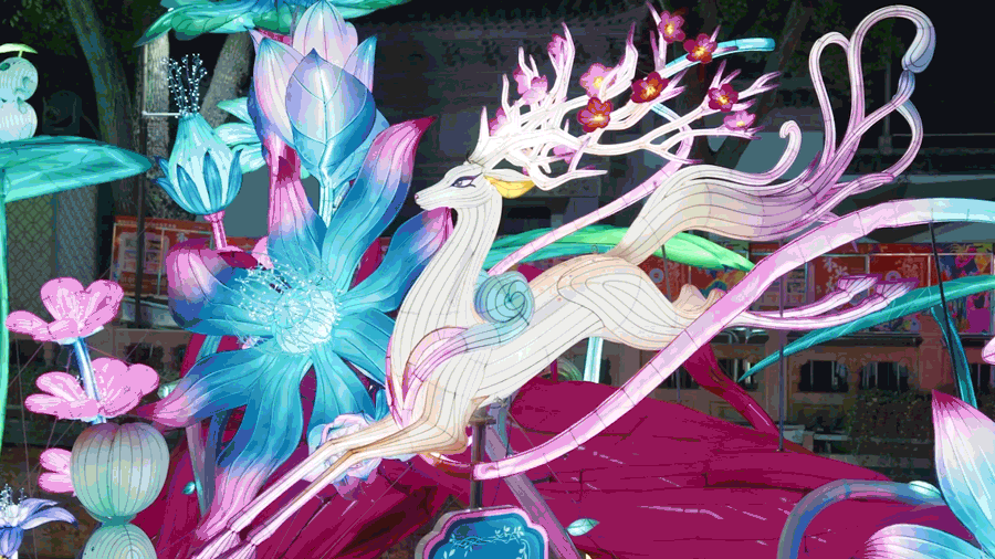 这一年的豫园灯会,不仅在设计上突破传统,更是在叙事上打破了传统生肖灯会的主题,以“山海奇豫记”为主题,对有着2000多年历史的文化典籍《山海经》做了深度提炼。活灵活现的《山海经》神奇动物,神秘绮丽的神花仙草,将整个豫园商城打造成为一个浪漫的上古奇幻世界。